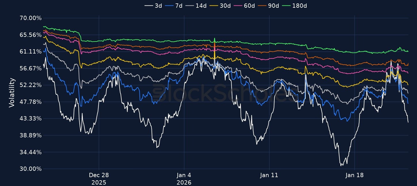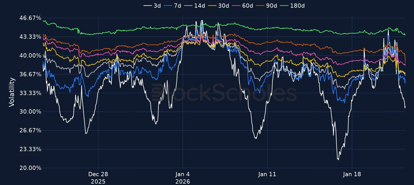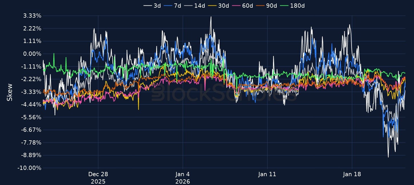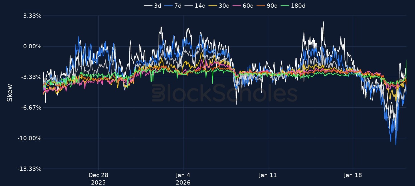 Risk assets rebounded after President Trump floated a “framework” Greenland deal that would drop a planned 10% tariff on NATO countries starting 1 Feb 2026. BTC is attempting to reclaim $90k and ETH is holding just above $3k, while short-dated options de-risked as the BTC 7D put–call premium compressed from roughly 10 vol points to about 4% and ETH 7D skew improved from -7% to -2.5%. US equities recovered with the S&P 500 up 1.16%, Nasdaq-100 up 1.36%, and Russell 2000 up 2.0%, alongside a 4 bp drop in the UST 10Y yield to 4.25%. Japan’s super-long JGBs also retraced as the 30Y fell 10 bps over 24 hours and the 40Y eased to around 4.0% from a 4.22% peak, while gold remained firm up 4.40% over five days above $4,800 and crypto headlines included Thailand’s ETF and futures push, US market-structure delays, TBIL tokenisation, Ondo’s 200 plus tokenised equities and ETFs on Solana, and BitGo’s IPO at $18 raising about $212.8m at roughly a $2b fully diluted valuation.