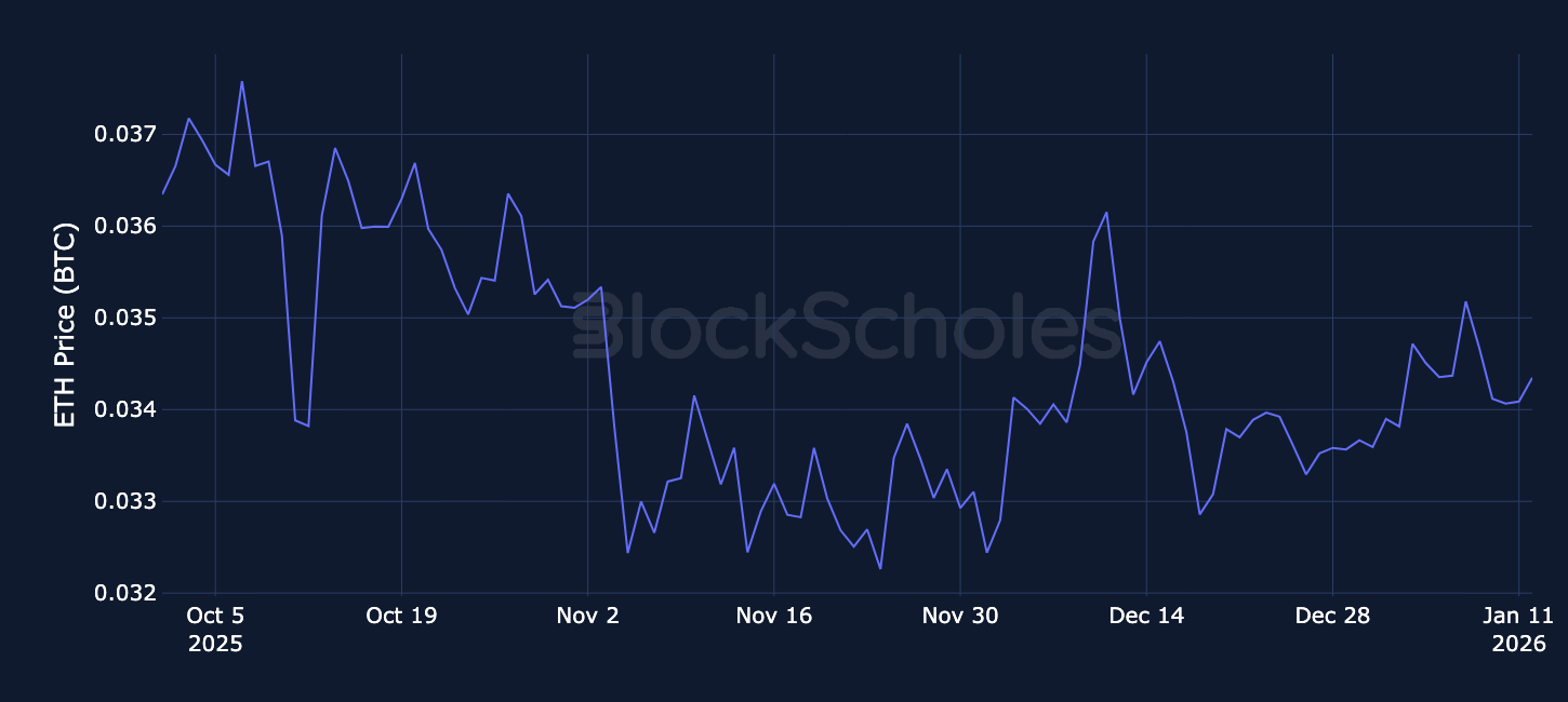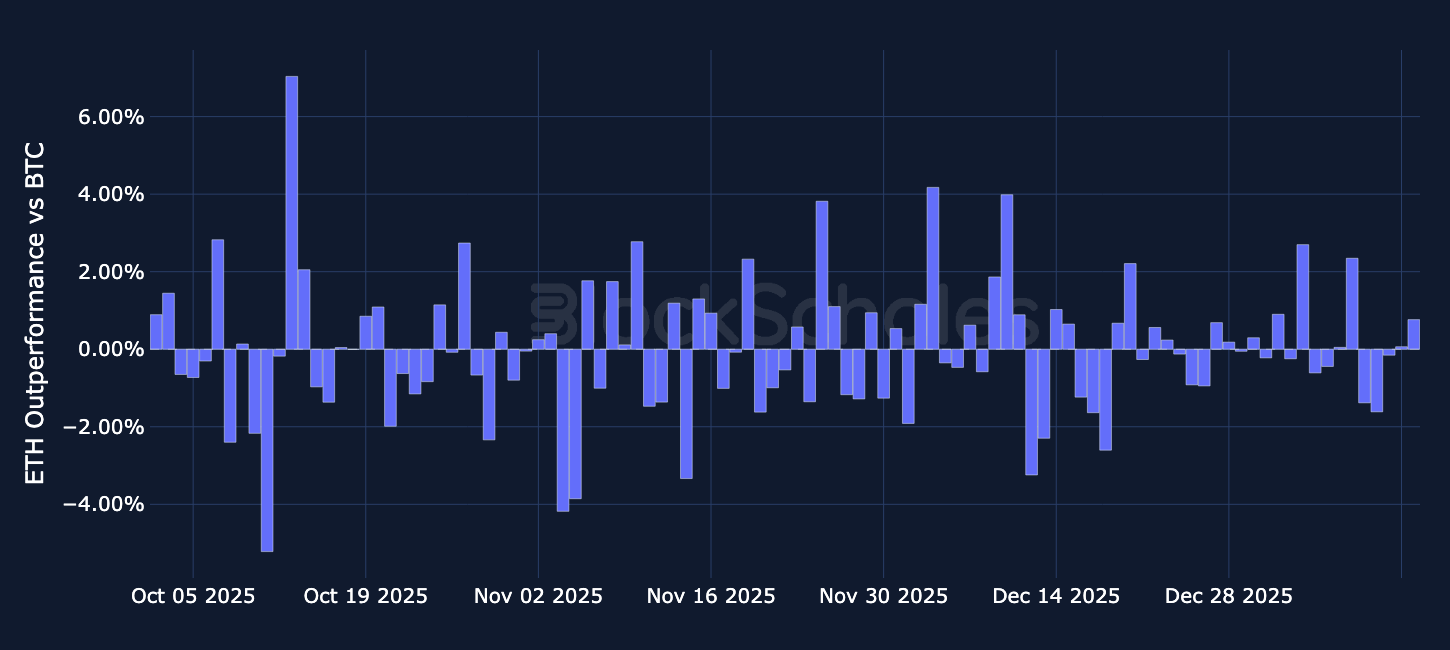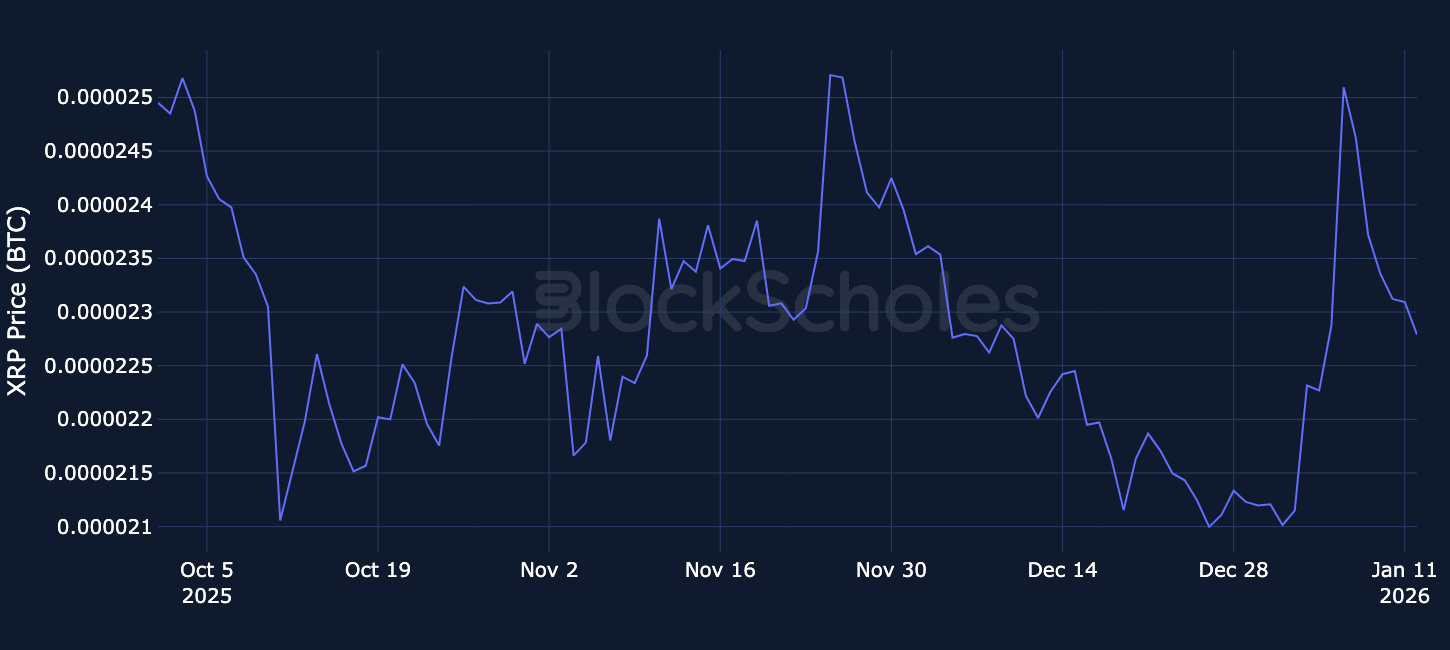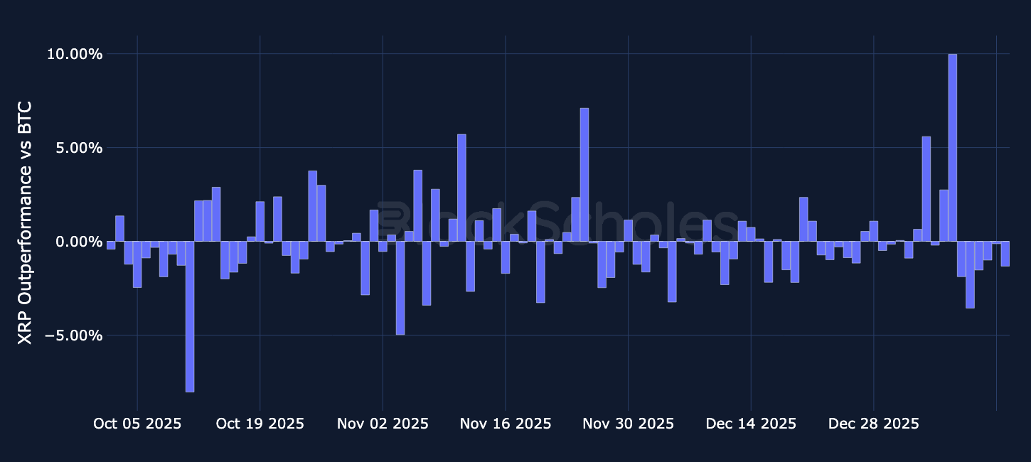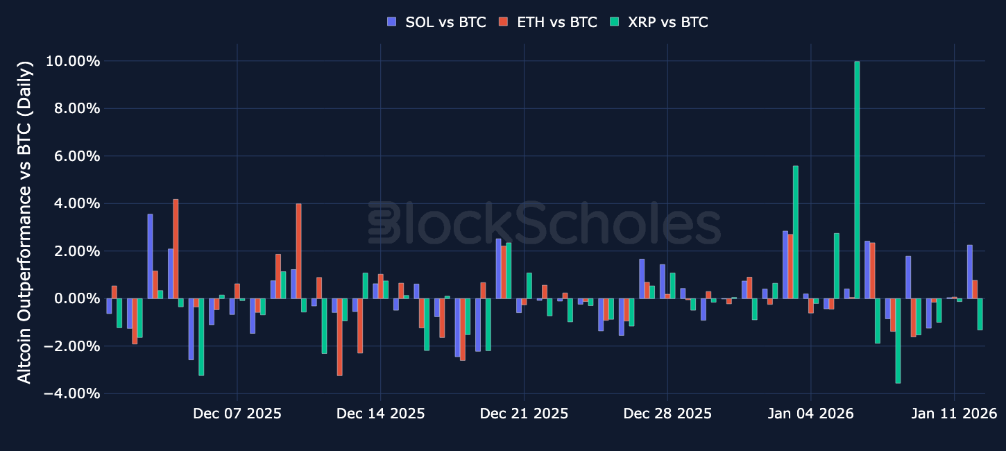 Altcoins Outperformance – Over the past week, SOL and ETH have largely moved in line with BTC, with most daily relative returns staying close to zero and only a few modest positive days. XRP has been the frontrunner, showing larger and more frequent spikes versus BTC, including a standout near +10% in early January, then pulled back to negative to almost -4%.