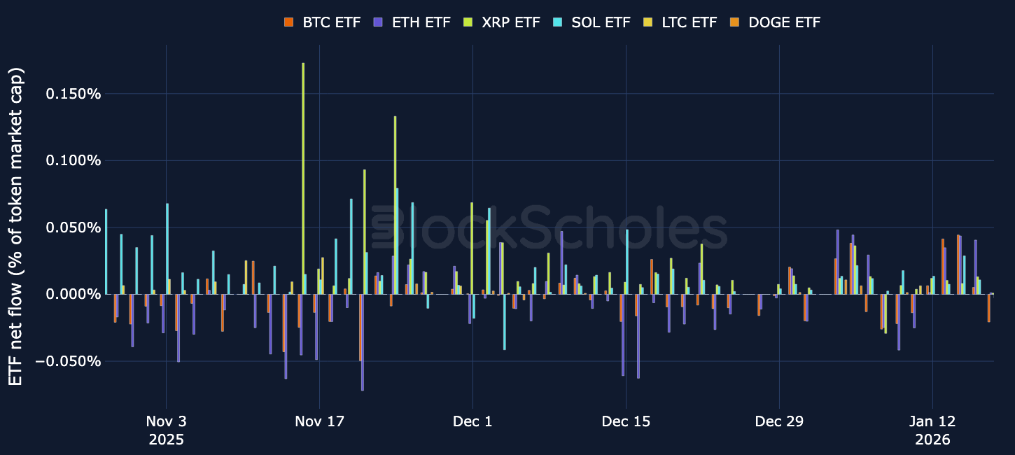 ETF Flows – Over the past week, BTC and ETH ETF flows were close to zero, with a couple of inflow days, but the most recent days showed small outflows again. Altcoin ETF flows were also mostly quiet, with only occasional small inflows - mainly in SOL and XRP — while LTC and DOGE were almost flat.