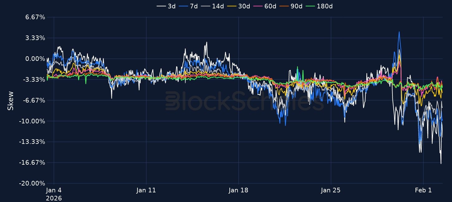 - For BTC, the put-call skew ratio for 7-day options trades at -13%, the most bearish positioning since late November 2025, when BTC fell to $80K.