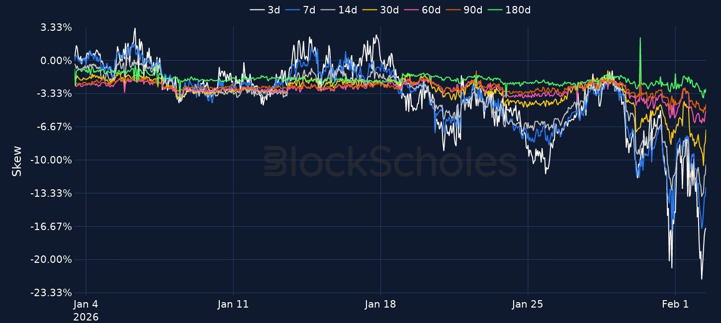 Crypto’s selloff deepened over the weekend, with BTC briefly touching $74,000, nearly 40% below its October 2025 all-time high, and ETH sliding 19% over the past week as roughly $300B was wiped from total market capitalisation. Derivatives markets turned decisively risk-off, with ETH funding rates flipping negative, put skews falling to post–Liberation Day extremes, and both BTC and ETH volatility term structures inverting as short-dated implied volatility surged. ETF flows also deteriorated, with $1.5B of spot Bitcoin ETF outflows and more than $300M of spot Ethereum ETF selling, while altcoin flows remained mixed, led by XRP outflows of 52.3M and smaller losses in SOL alongside modest DOGE inflows. Broader macro volatility added pressure as the US dollar rallied sharply on Federal Reserve leadership developments, precious metals suffered heavy losses, and geopolitical tensions in the Middle East continued to weigh on risk sentiment.