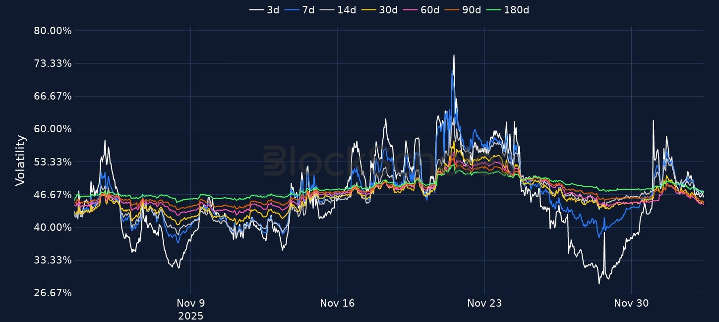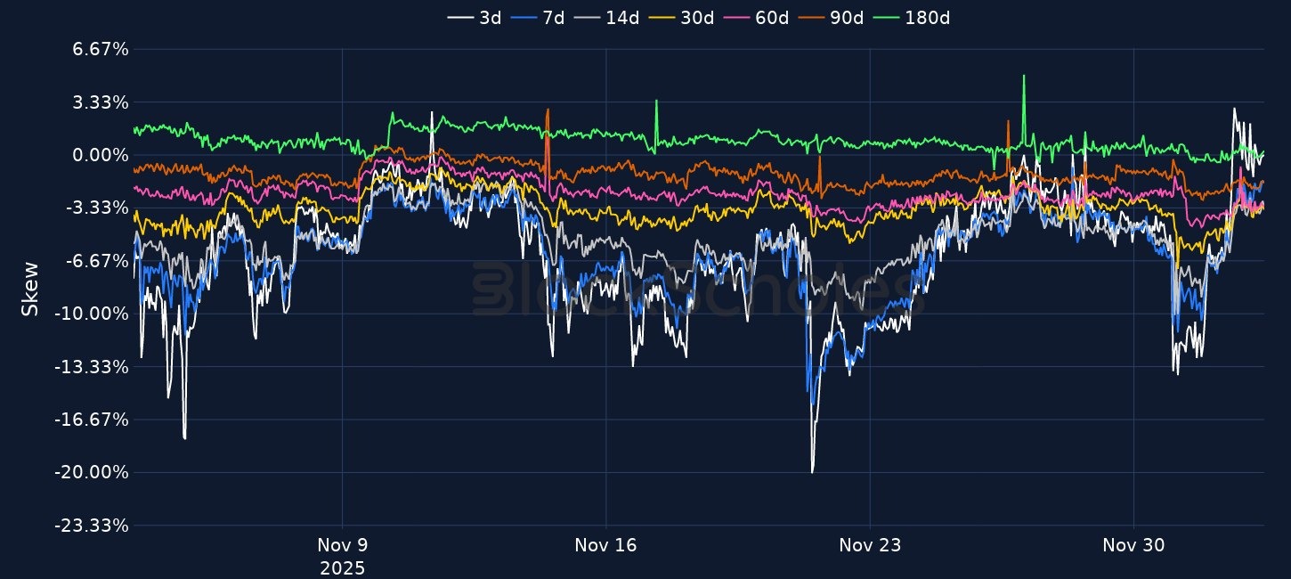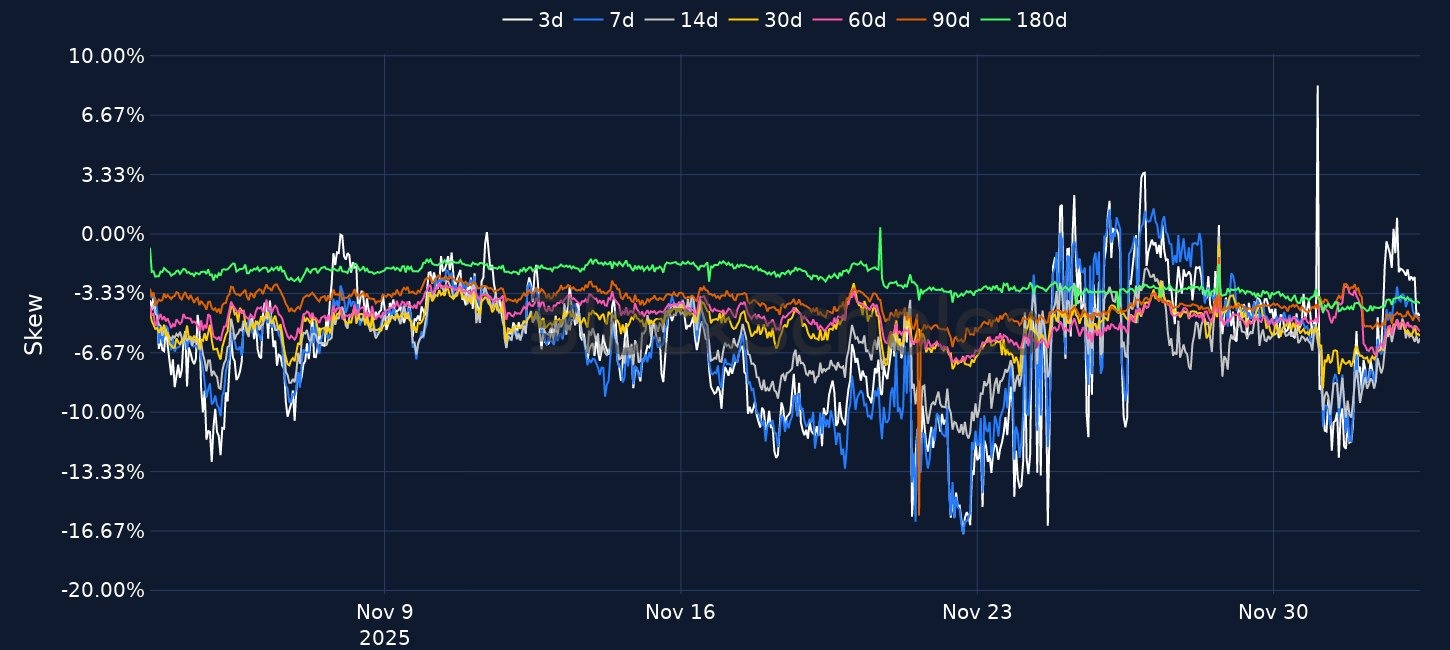 BTC rallied 7% to just above 93K and ETH 9% to reclaim 3,000, lifting total crypto market cap back above 3T even as BTC spot ETFs saw only 58.5M of inflows versus a 121.6M post-launch daily average, though this still marked a fifth consecutive day of positive flows. Rates markets now price an 87% probability of a 25bp Fed cut in December, while BTC short-tenor volatility smiles have compressed from an 11 vol put premium to 4 vols and ETH from 10 vols to 2, indicating reduced demand for downside hedges. Elsewhere, Bitmine purchased 18,345 ETH worth about 55M, Kraken agreed to acquire tokenised-equity issuer Backed Finance, and Hyperliquid and Sonnet completed their merger to form HYPE under the ticker PURR, alongside ongoing developments around the GENIUS stablecoin Act, the UK Property Digital Assets Act 2025 and Vanguard’s move to allow trading in funds with crypto exposure.