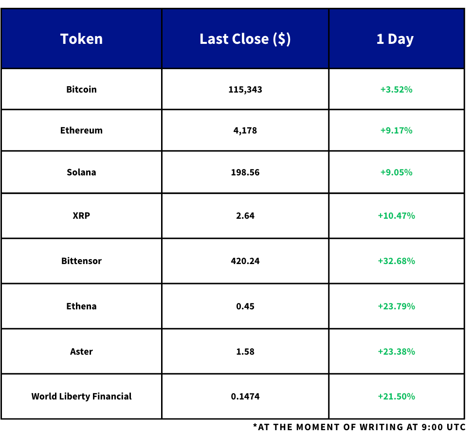 - ETH is up 8% on the day, trading at $4,100, though plummeted from a level of $4,700 last week.