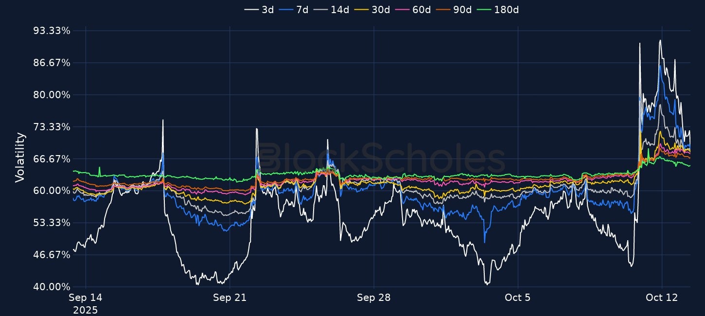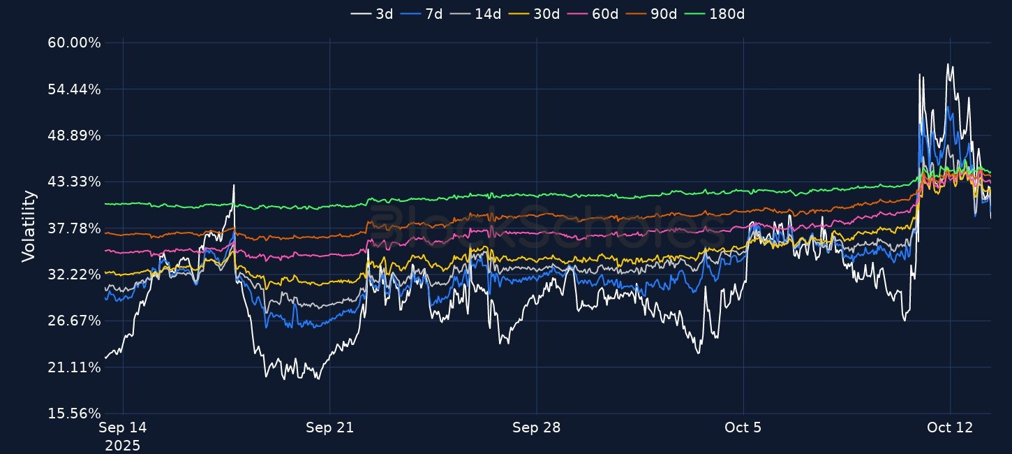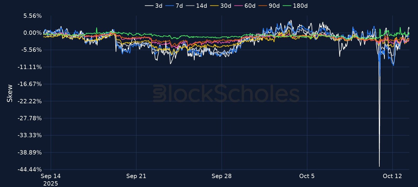 Crypto markets rebounded sharply after President Trump signaled a willingness to ease trade tensions with China following record $19B in liquidations. BTC recovered from a $102K low to $115K, while ETH rose 8% to $4,100, though both remain below recent highs. BNB outperformed, hitting a new all-time high of $1,369.99 after surging 16% overnight. BTC’s term structure disinverted but implied volatility remains 4–5 vol points higher across maturities, suggesting lasting uncertainty. ETH options show stronger long-term bullish sentiment compared to BTC. Meanwhile, gold surged to record highs above $4,070 as safe-haven demand persisted.