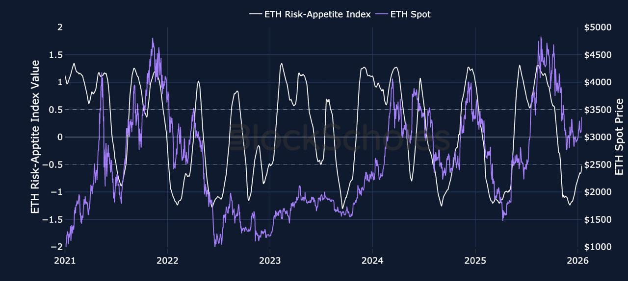 BLOCK SCHOLES ETH RISK APPETITE INDEX – Risk appetite in ETH has risen faster than in BTC, with the index looking poised to break above -0.5. Spot price year-to-date is up more than 13%, supported by strong Spot ETF inflows and major demand for ETH staking. In last week’s report we mentioned that the Beacon Chain’s entry queue had grown past 1.7M ETH – that’s now above 2.5M ETH. In addition, nearly 30% of the circulating supply of Ether is already currently being staked, a level last observed back in July 2025. Finally, BitMine purchased 24,266 ETH in the past week, with the company now owning 3.45% of the token’s outstanding supply. In the words of Tom Lee, the DAT is the “largest 'fresh money' buyer of ETH in the world”.