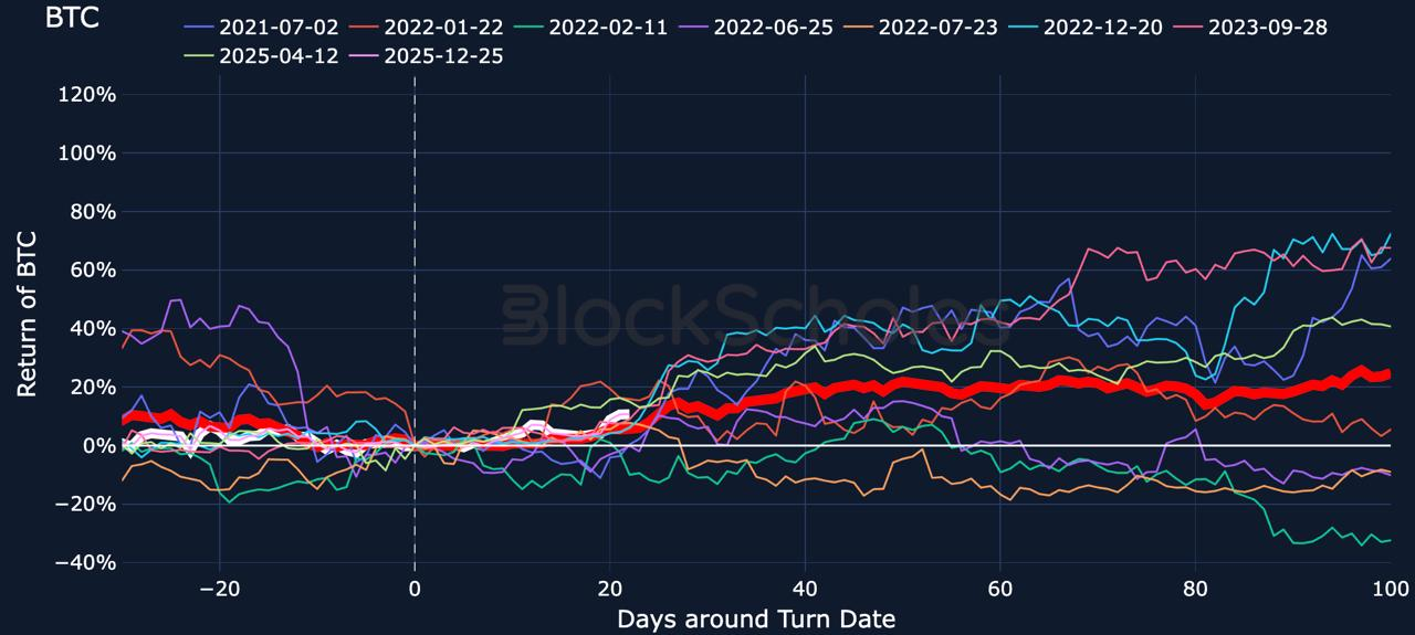 Looking at the performance of spot price since the most recent crossing of the -1 threshold in our Risk-Appetite Index, we find that BTC is currently outperforming the median return based on past crossings of the -1 mark.recent attempt earlier in the week on January 5, 2025, and it currently changes hands at $90K.