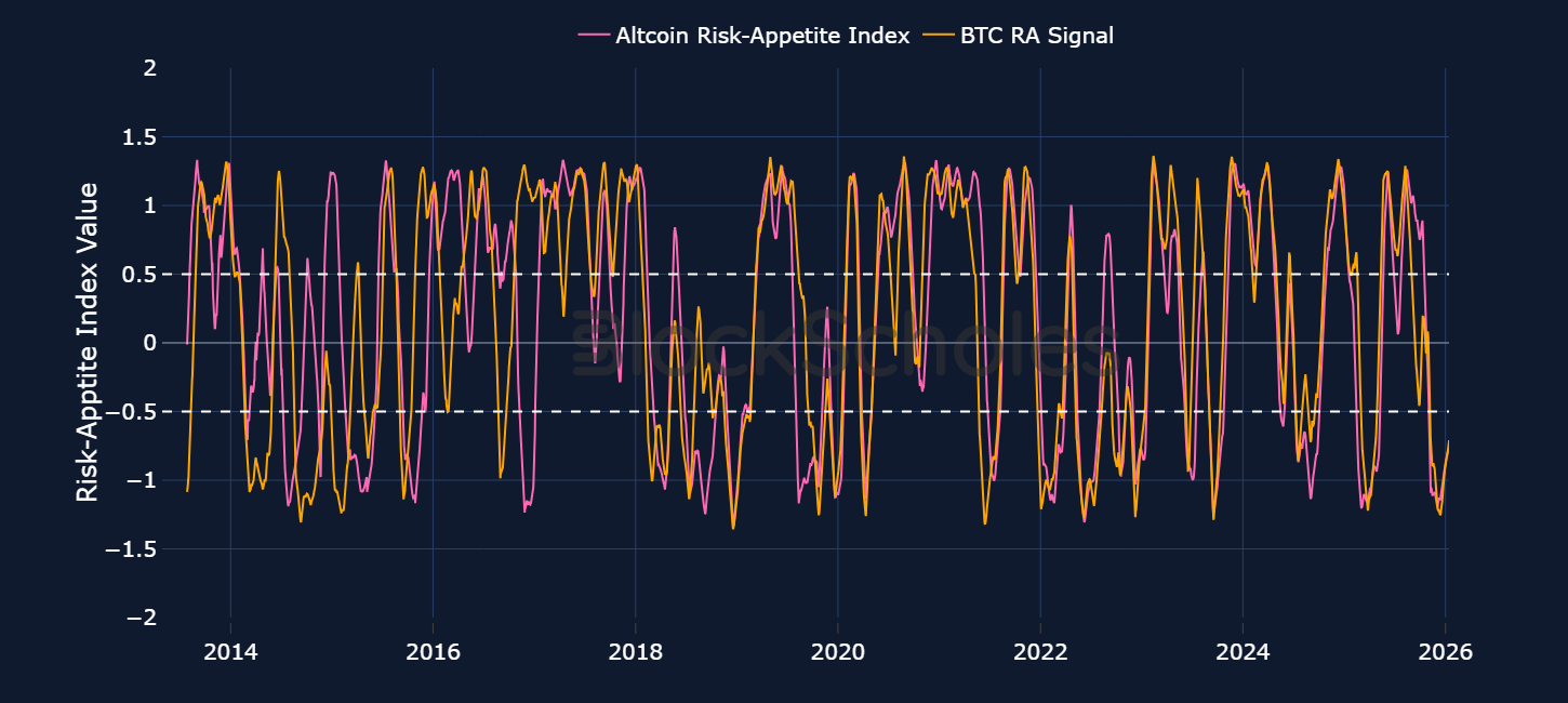 A wider lookback period comparing our BTC Risk-Appetite Index and the Altcoin Risk-Appetite Index we find evidence that the latter often peaks and declines at a slight lag to the BTC indicator. That likely is a reflection of the capital rotation pattern observed in crypto markets where historically capital has flowed from BTC into altcoins in later parts of the cycle.