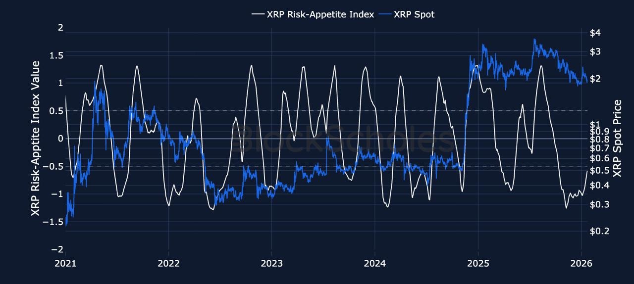 BLOCK SCHOLES XRP RISK APPETITE INDEX – XRP is so far lagging behind the major blue-chip altcoins, though is showing a similar upward trajectory towards -0.5.