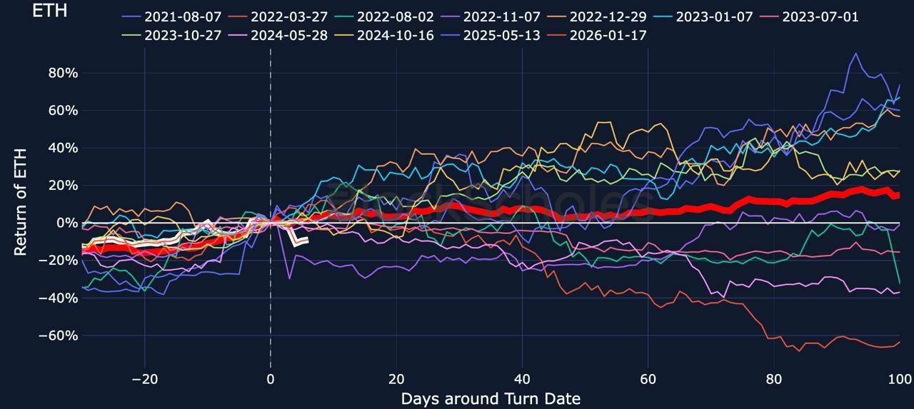 BLOCK SCHOLES ETH RISK APPETITE INDEX – Our risk-appetite metric for ETH crossed -0.5 earlier than it did for BTC, and currently shows a higher value than BTC. So, far however, ETH returns are underperforming relative to the historical median of a -0.5 crossing.