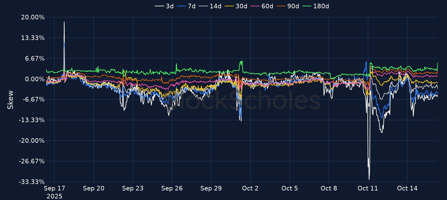 Crypto markets remain volatile following record liquidations, with BTC hovering around $110K and ETH stabilizing near $4,000. Spot ETFs for both assets have seen continued outflows, adding to bearish sentiment. Options markets show heightened implied volatility — 40% for BTC and 70% for ETH — and persistent bearish put-call skews. On the macro front, U.S. equities were choppy but ended slightly higher amid renewed tariff tensions with China. Gold surged past $4,200 per ounce as investors sought safety. Meanwhile, institutional activity remained strong, with developments including BitMine’s massive ETH accumulation, OKX’s expanded custody partnership with Standard Chartered, and Kraken’s acquisition of a U.S.-regulated derivatives exchange.
