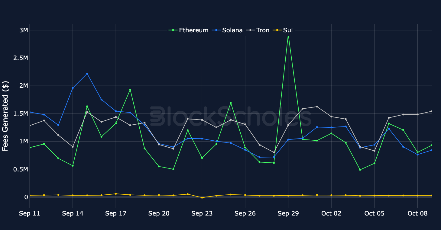 Daily Fees Generated across Ethereum, Solana, Tron & Sui