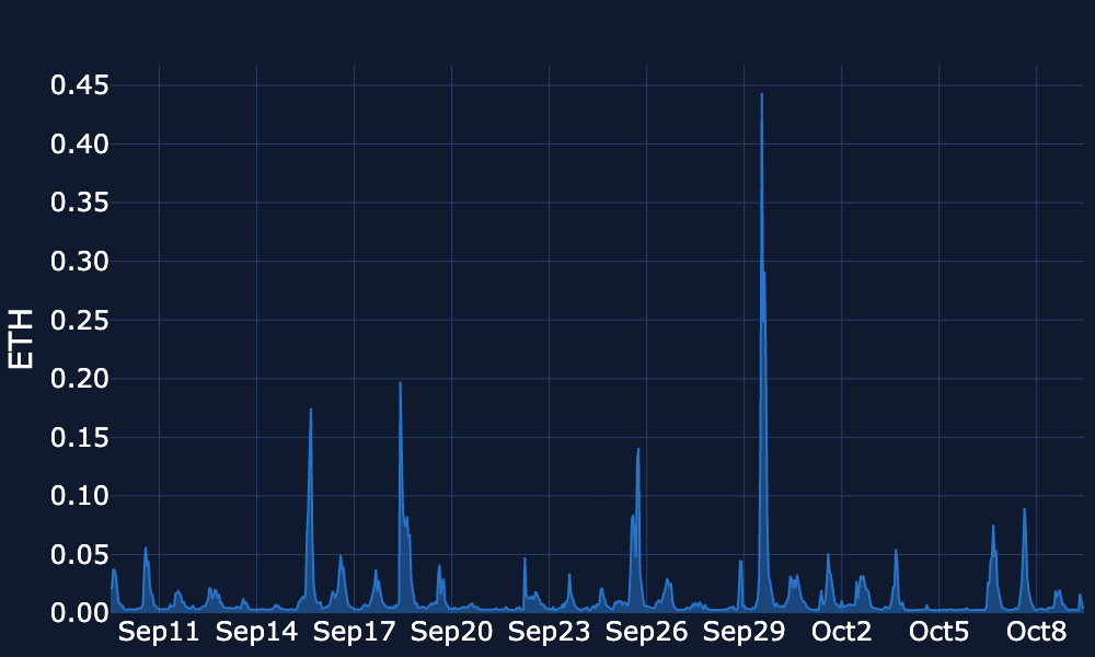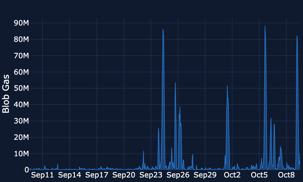 Blob Gas Usage - There were significant spikes in Hourly Average Excess Blob Gas on October 2, 5, and 8, each surpassing 80M. Since the beginning of the month, average blob gas usage has even exceeded 900k, highlighting the sustained increase in Ethereum L2 data roll-up activity.