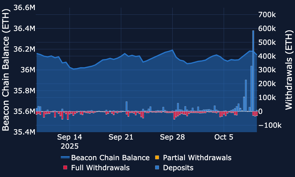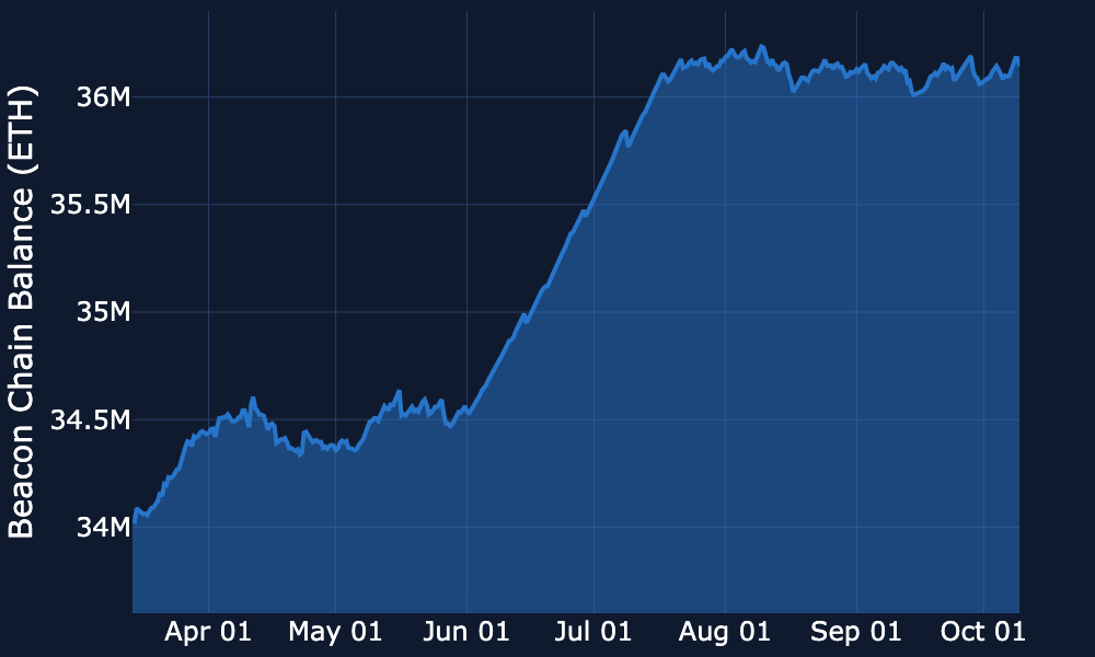 Beacon Chain - ETH staked on the Beacon Chain has remained steady at around 36M since July 2025.
