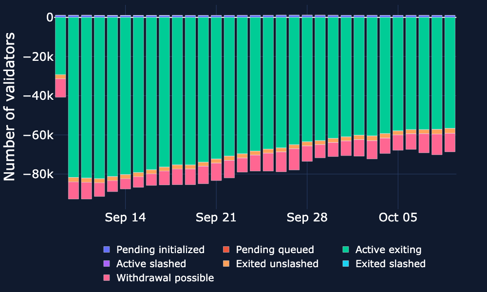Beacon Chain Validator States - Active exiting validators continue to dominate validator state activity following their spike on 10 September. However, they have since started to decrease, alongside a slight decline in withdrawals possible.