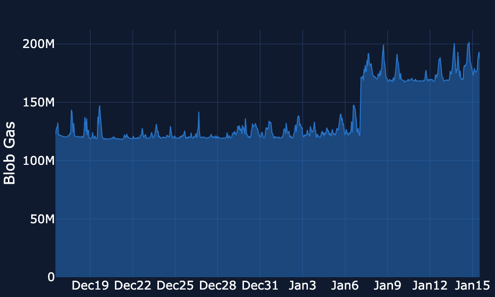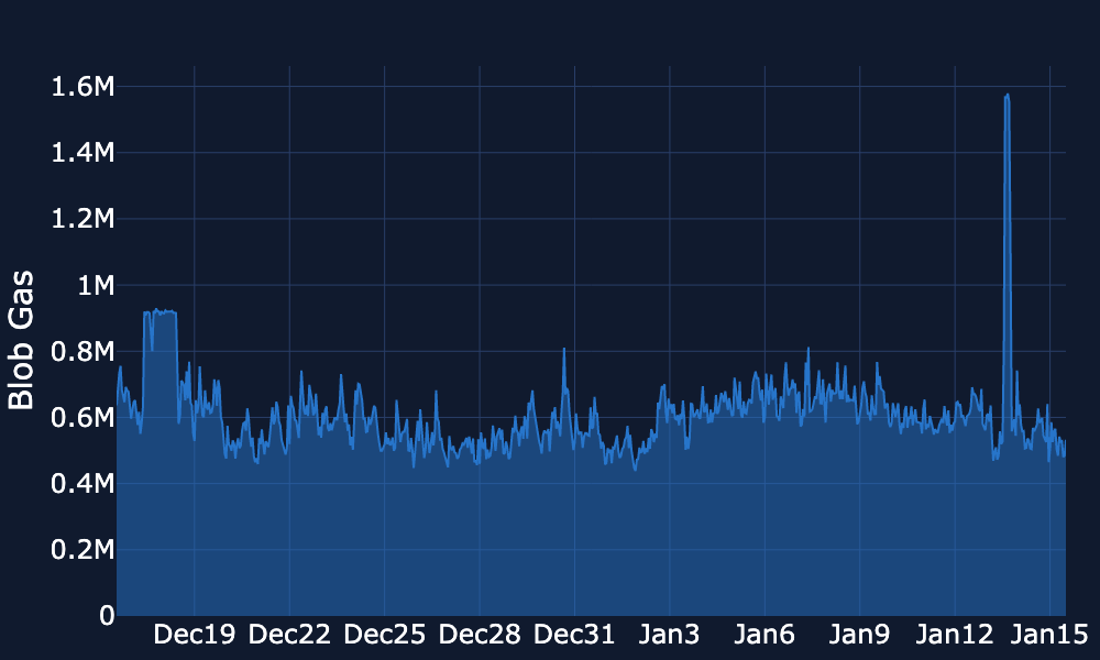Blob Gas Usage – Over the past week, blob gas usage remained low and steady for most of the period, however, it was followed by a significant spike on Jan 14 and almost reached 1.6M, then decreased back to the previous levels of 0.8M-0.6M.