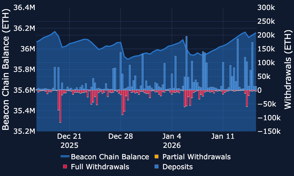 Beacon Chain - Over the past week, the balance increased, rising from just under ~36.0M ETH to around ~36.2M ETH.
