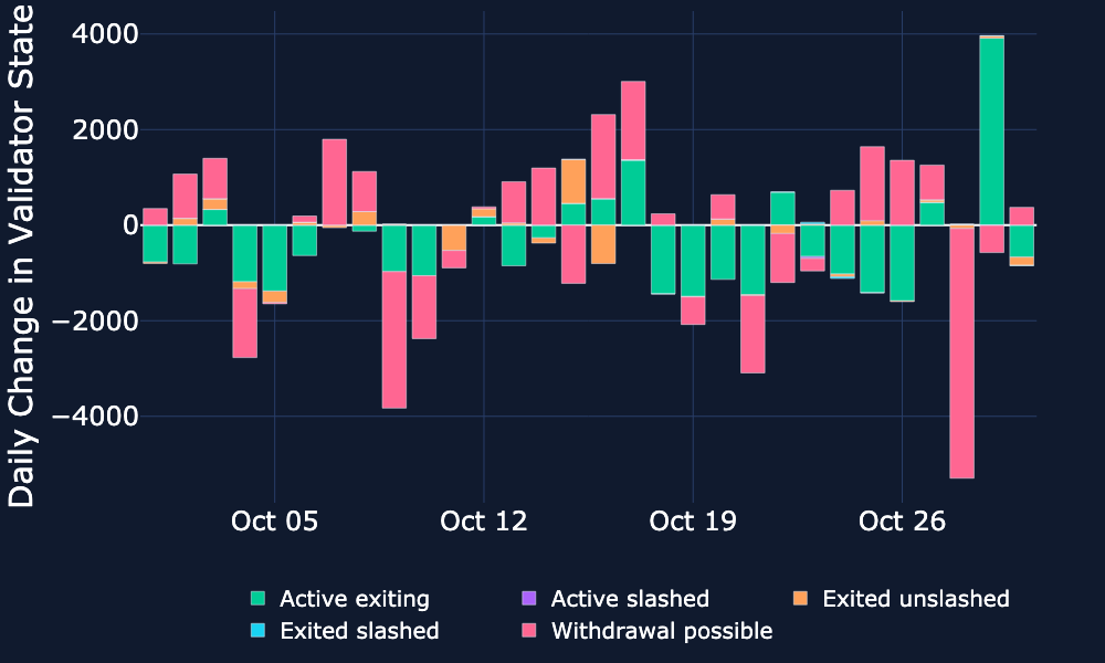 Beacon Chain Validator States – Validators with withdrawal possible decreased mid week by around 5K as they exited the Beacon Chain. The next day, active exiting validators trended up, by around 4K in single day move.