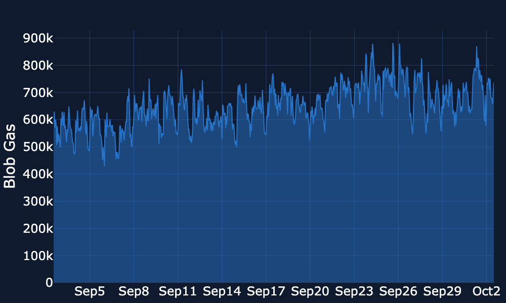 Blob Gas Usage - Usage continues to edge up, albeit with fluctuations. In early September, average blob gas usage fluctuated around 550k, while current figures are trending around 650k, reflecting the increase in Ethereum L2 data roll-ups.