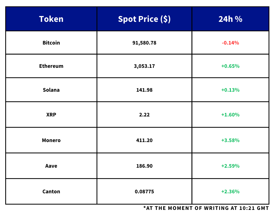 Gold extended its move higher to ~$4,192/oz, pushing to its strongest levels since mid-November, while Japan’s October retail sales surprised to the upside with the fastest YoY pace since June (1.7% YoY, 1.6% MoM). BTC traded in a tight $90K–$91.5K range and is roughly 0.15% higher on the day, with ETH up ~1.3% around $3,000. Animoca Brands is doubling down on stablecoins and RWA tokenisation with a 2026 build-out and planned Nasdaq reverse-merger listing, BitMine has continued scaling its ETH treasury following a $200M purchase plan, and Upbit’s parent Dunamu has committed to fully covering a ~$37M multi-token hot-wallet theft.