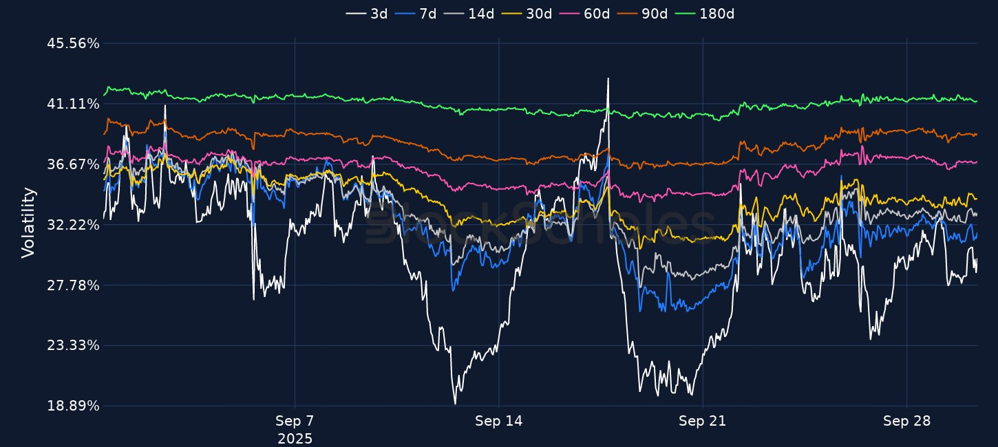 A modest recovery in crypto-asset spot prices over the past 24 hours has had a noticeable impact on volatility smiles. Both BTC and ETH short tenor options have eroded much of their negative skew towards puts as we head into October, a month that has historically been bullish for BTC. Spot ETFs also reversed their recent run of outflows yesterday. US equities ended yesterday's trading session 0.3% higher while gold reached another all-time high. A slew of Fed speakers offered diverging views on the path of monetary policy.