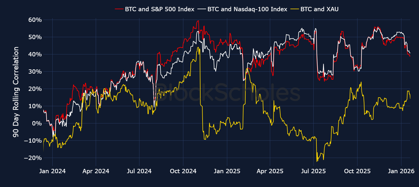 BTC has continued to maintain its correlation to risk-on US equities in the new year, with the 90-day rolling correlation to the S&P 500 and Nasdaq-100 around 40%. On the other hand, its correlation to safe haven precious metals remains low, with both gold and silver concurrently recording new highs.