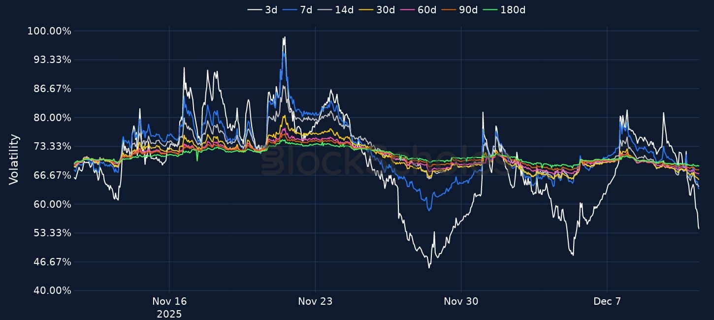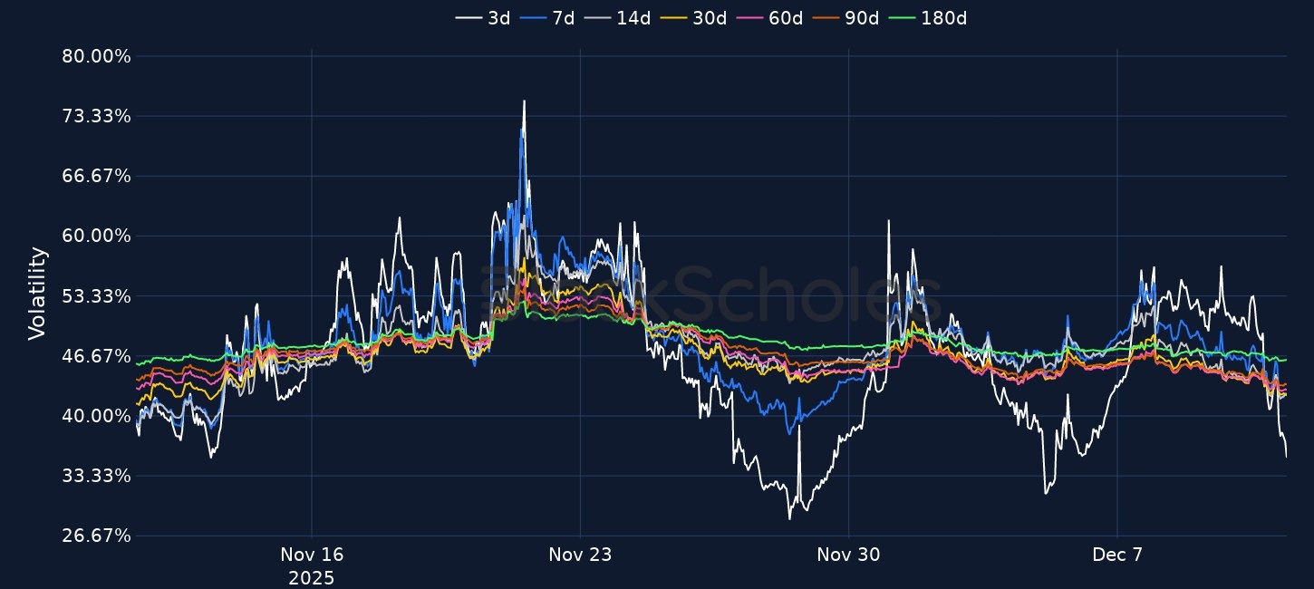 - ETH skews are also negative, with short-dated tenors near -6% meaning OTM puts trade about 6 vol points over OTM calls.