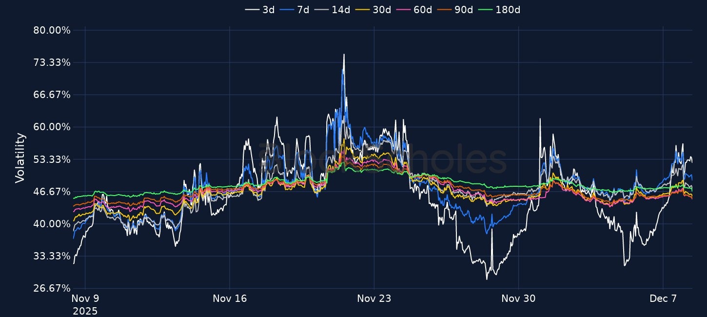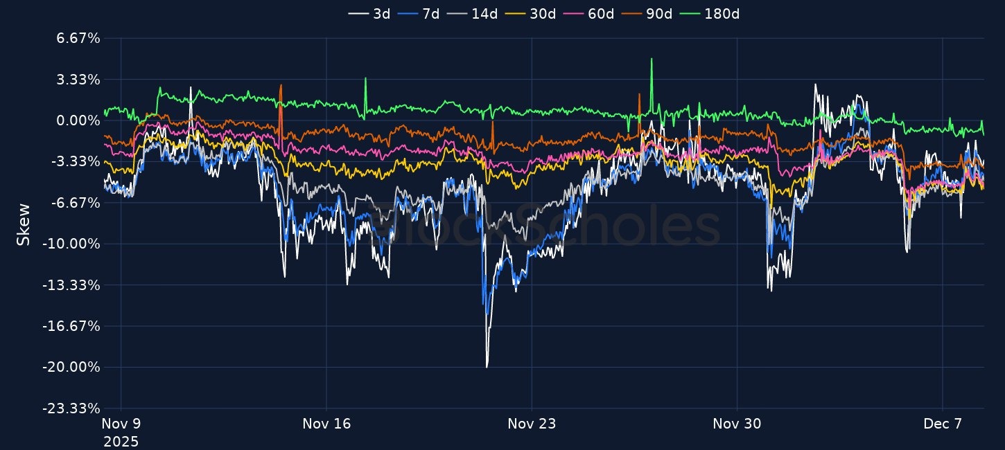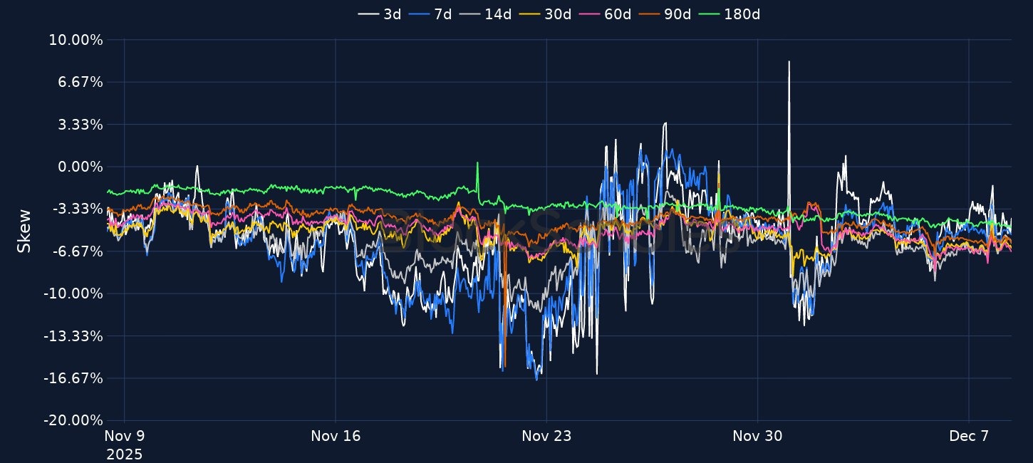 Bitcoin has rebounded from a sideways range around $89K to $92K, while Ether has moved from $3K to just under $3.2K, despite weekly outflows of $87.7M from spot BTC ETFs and $65.4M from spot ETH ETFs. Implied volatility term structures are modestly inverted, with 7D BTC IV at 50% versus 47% for 180D, and 7D ETH IV at 73% versus 70% for longer tenors, while 30D skew sits at -6% for BTC and -4% for ETH, indicating a smaller downside premium for Ether. In traditional markets, the S&P 500 is up over 17% year to date and sits just below its October all-time high, while BTC is now -2% year to date after the October liquidation. Into Wednesday’s final FOMC meeting of the year, markets are pricing an 87% probability of a 25bp cut, with core PCE at 0.2% MoM and 2.8% YoY, and University of Michigan consumer sentiment ticking up to 53.3 in December from 51 in November.