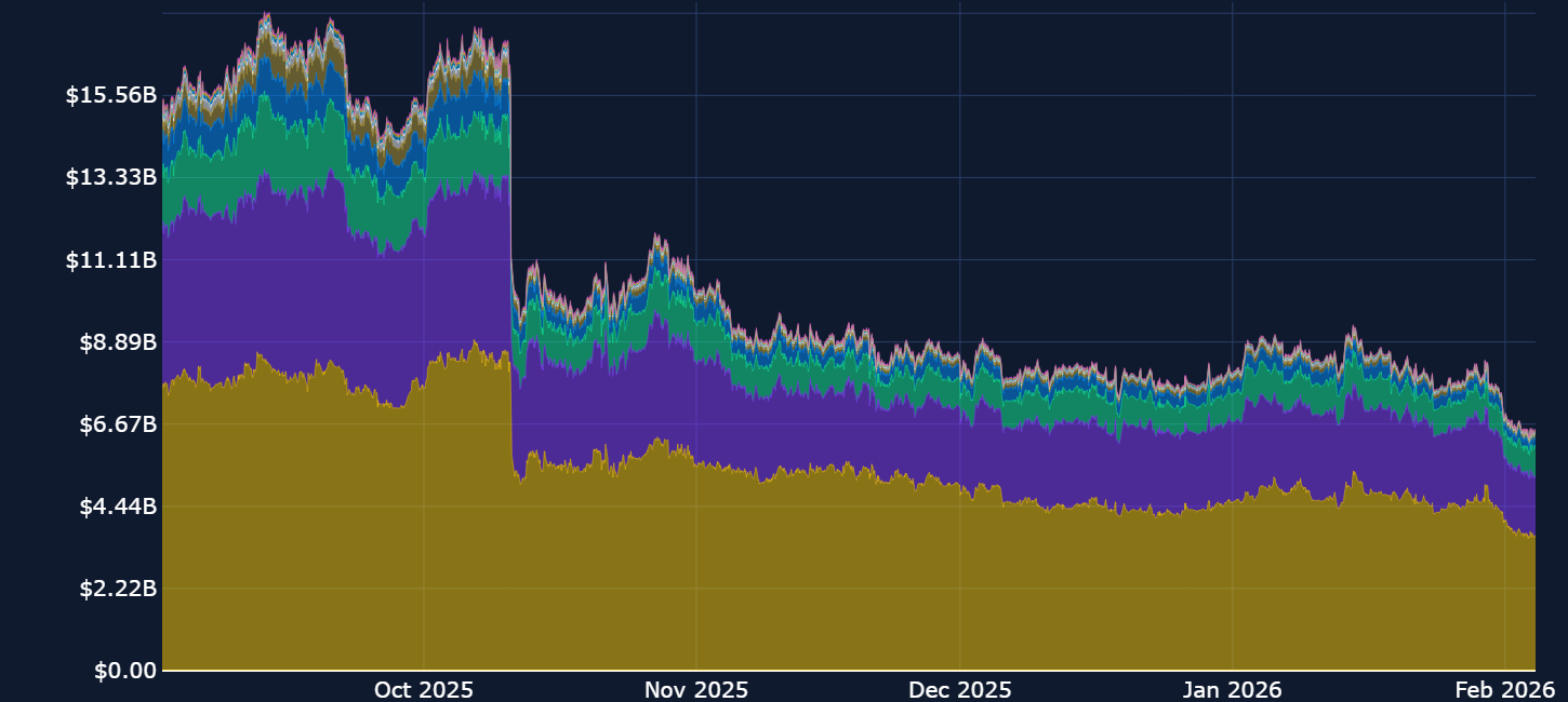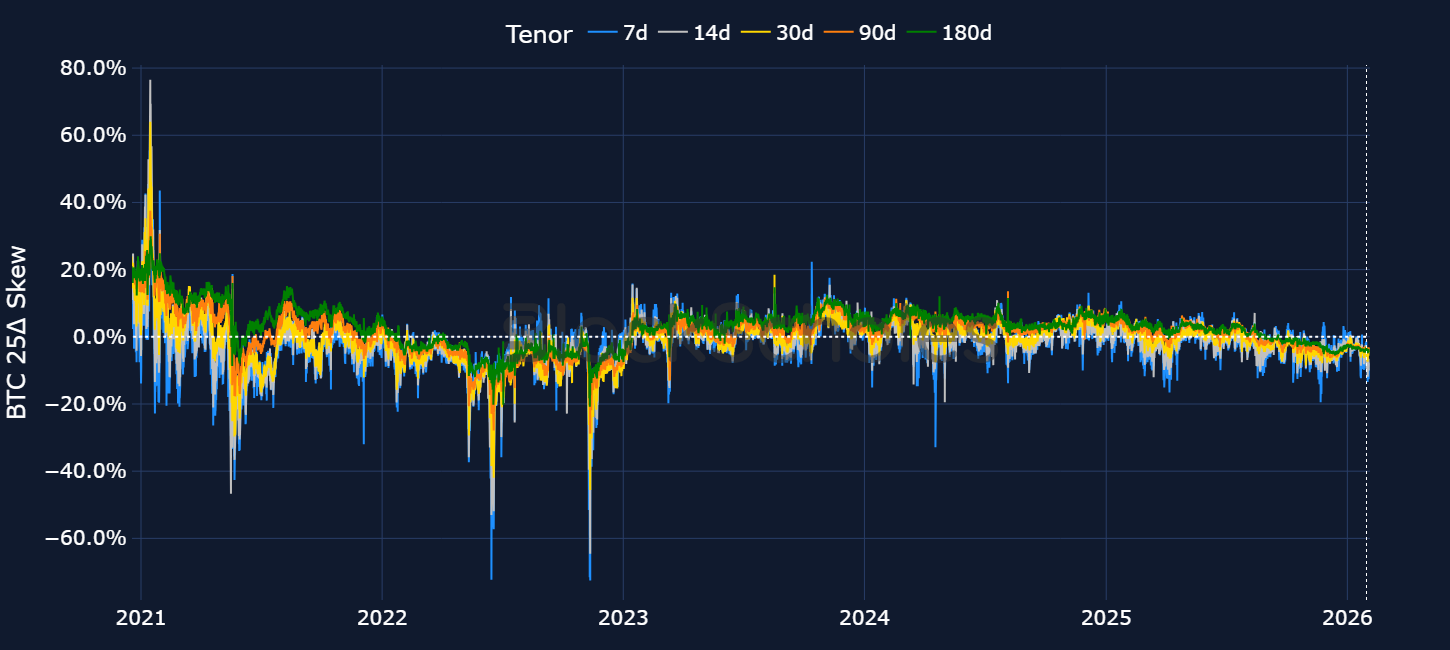 Risk appetite has deteriorated sharply over the last week, with nearly $500B wiped from total crypto market cap since late January, with BTC’s 40% drawdown from the $126K peak accompanied by a fall in perp open interest from ~$5B to ~$3.6B. The move has triggered the largest level of liquidations across crypto markets since the Oct 10, 2025 crash and sees BTC trade below the average purchase level across all spot ETF holders for the first time since before President Trump’s reelection.