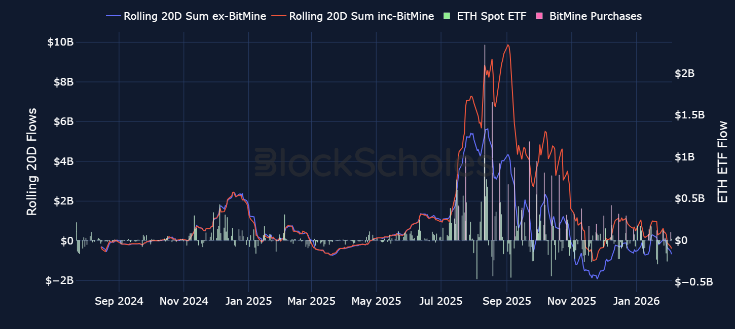 Plotting the same 20-day sum of ETF flows and flows including BitMine purchases, it is clear that momentum both from ETF buyers and BitMine is waning.