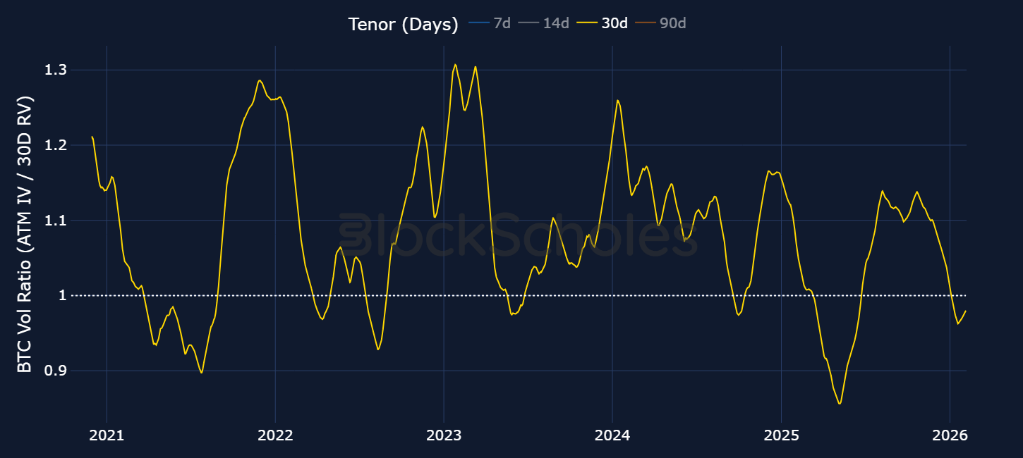 Not only is implied volatility closer to 50% for short-to-mid-dated options this time around, the ratio of BTC ATM implied volatility to realized volatility also indicated that options markets have priced in lower forward looking volatility expectations than the volatility that has been recently delivered (a ratio below 1). Compare that to 2022 for example during the FTX crash when implied volatility averaged 1.3x that which was delivered by spot prices.