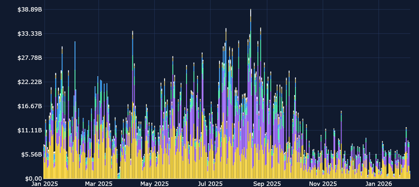 Trading volumes on Hyperliquid have recently exceeded $10B per day, driven by a surge in RWA-perp related trading. Over the past two weeks, daily 24-hour volume on Hyperliquid’s Silver perp contracts has repeatedly exceeded $1.5B, driven by first the rally and then subsequent correction in precious metal prices. Given Hyperliquid’s aggressive buyback program (which allocates 97% of the protocol’s revenue towards token buybacks), HYPE’s 30% rally over the past 30 days is perhaps somewhat unsurprising.