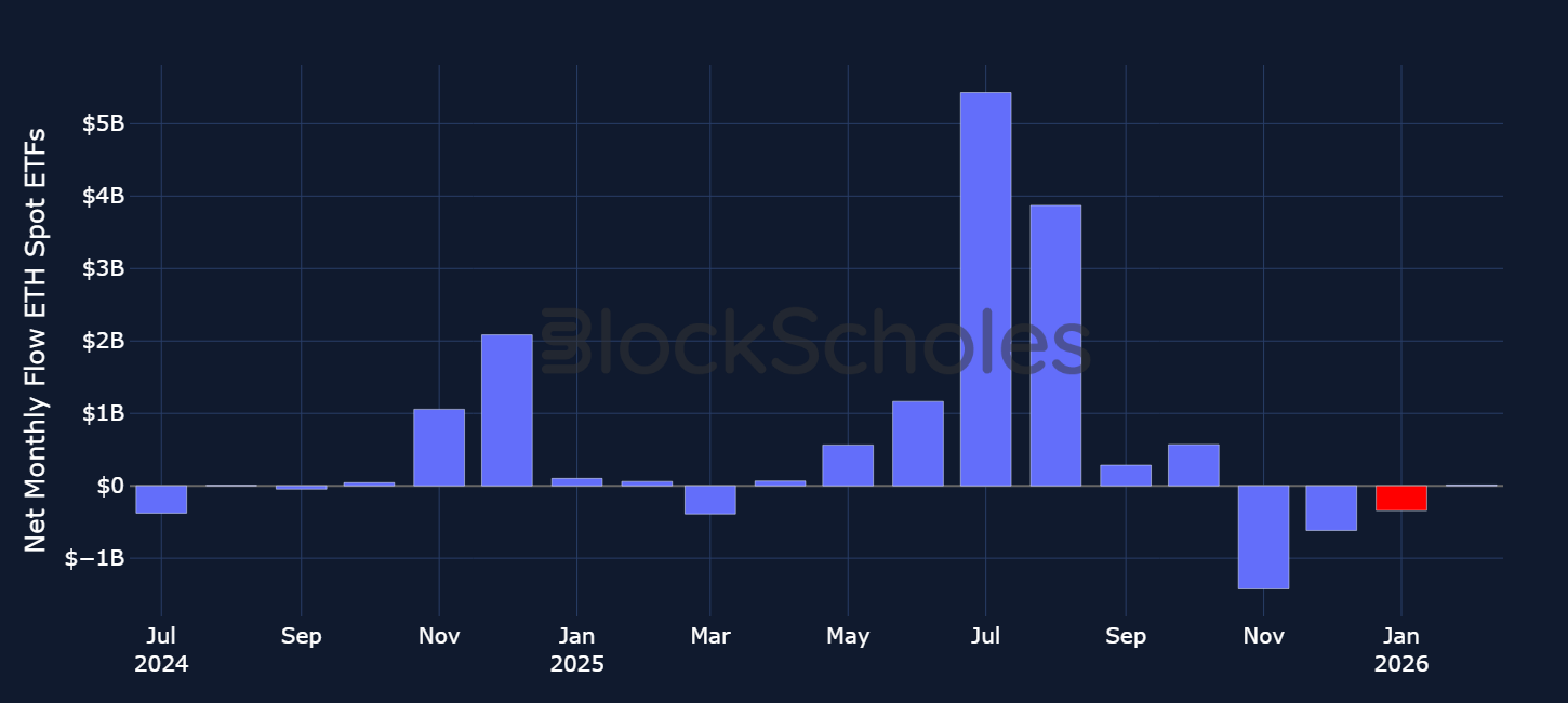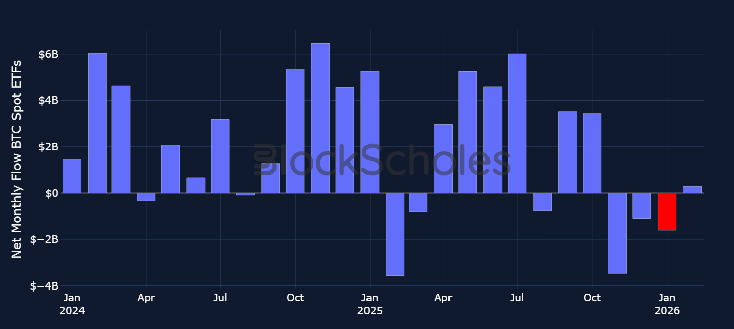 In 2025, spot price rallies in both BTC and ETH were consistently supported by strong streaks of positive inflows into Spot Bitcoin and Spot Ethereum exchange-traded funds. It is perhaps unsurprising therefore, that the declines in spot prices post October 10, 2025 have coincided with mostly an exodus away from Spot ETF products. The first month of 2026 saw BTC Spot ETFs sell $1.6B worth of bitcoins, registering their third-worst month since launch in January 2024 – with only February and November 2025 seeing more outflows.