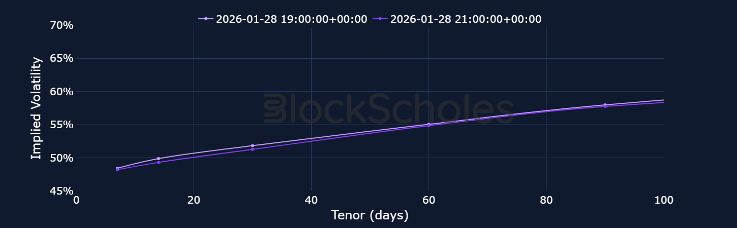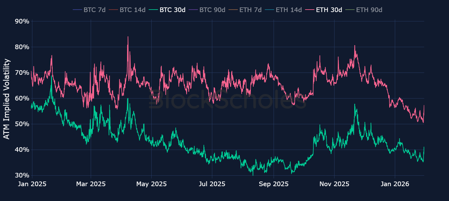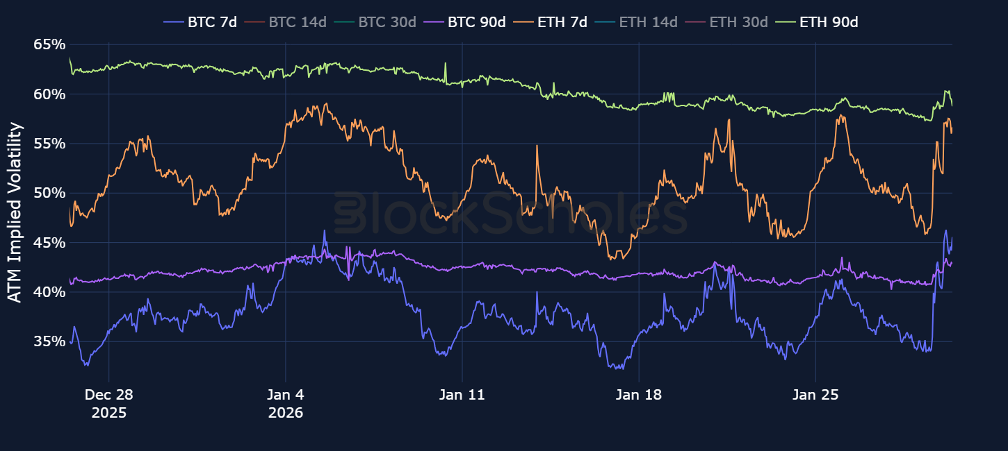 That sharp decline has been enough to inspire sharp movements in at-the-money implied volatility — particularly at shorter tenors. BTC’s one-week at-the-money implied volatility level has spiked 12 percentage points to trade at 46%, while ETH volatility jumped 11 vol points to 58%.