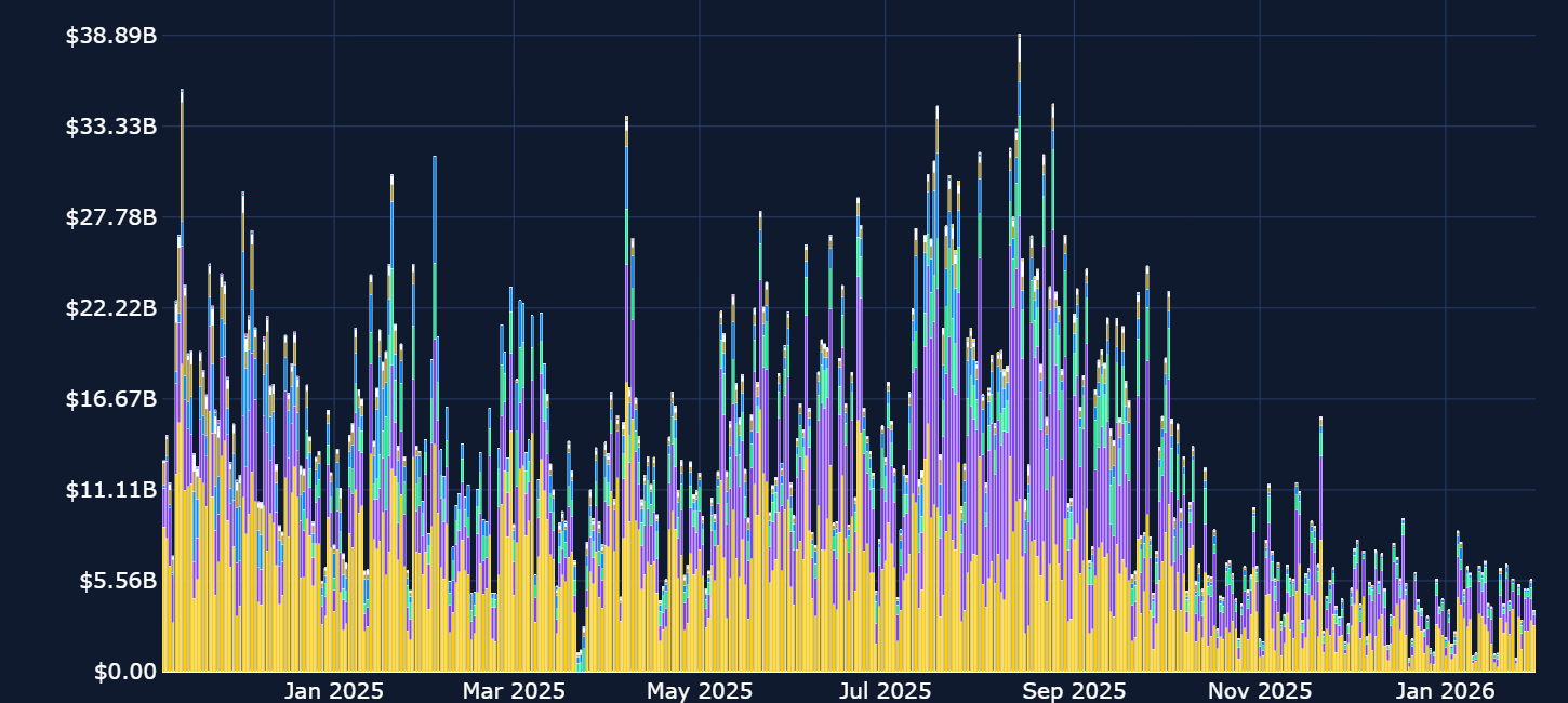 Daily trade volumes in perpetuals are equally far lower than levels seen in the first three quarters of 2025 (chart below).