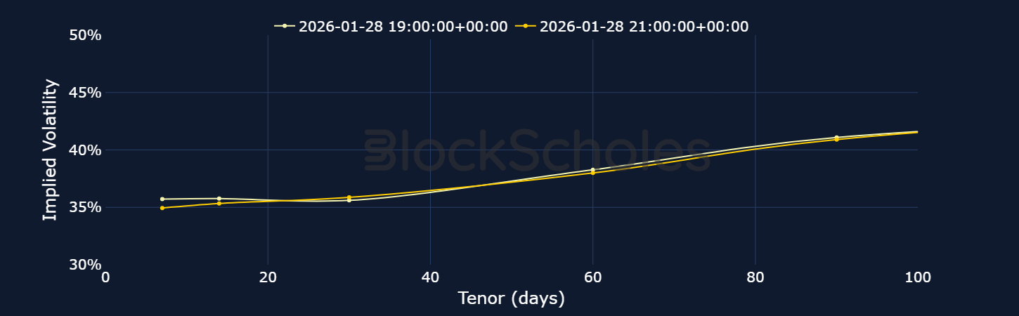 Even the Fed’s first meeting of the year, which saw the FOMC vote 10-2 in favour of leaving the benchmark federal funds rate, did very little to impact volatility expectations. We can see that by comparing the term structure of volatility before and after Chair Powell’s press conference for both majors.