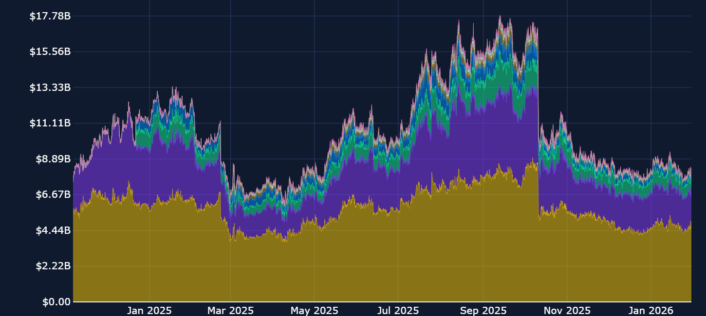 Potentially contributing to the wider trend of lower volatility is the current lack of participation from traders across markets. Open interest in perpetual futures contracts (a good measure of willingness of trader participation and leverage in the market) is well below the peak levels reached prior to and around the time of the October 10 liquidation event. Not only is open interest well below those peaks, daily trade volumes are equally far lower than levels seen in the first three quarters of 2025.