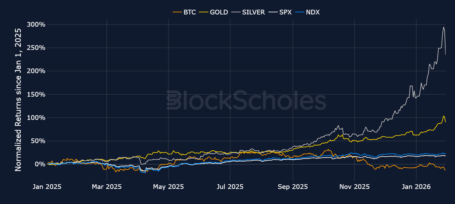 A sharp reversal in precious metals has seen crypto take another leg lower, with the broader market losing around 4.7% of total crypto market cap in 24 hours. The move leaves BTC and ETH down over 5% and 8% year-to-date respectively – BTC around $82K puts it more than 30% below the Oct 6, 2025 high of $126.1K.