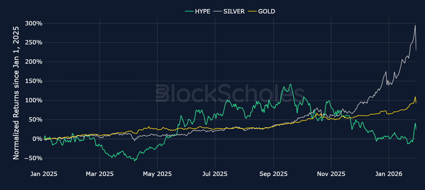 Hyperliquid’s buyback program attributes 97% of protocol revenue to token buybacks which makes the domino effect very clear: higher volumes traded on the back of silver and gold perps (and other RWA-perps) result in more token buybacks, which lower token supply, and help bolster price. We can see from the chart below that HYPE has positioned itself as a second-order beneficiary of the current rally in precious metals.