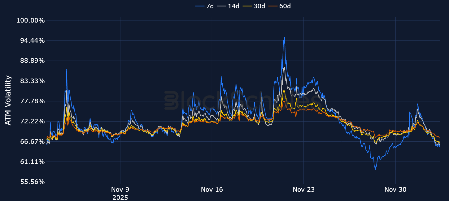 BYBIT BTC SVI ATM IMPLIED VOLATILITY — The term structure of volatility has seen two small and short-lived inversions so far in December, though front end volatility is yet to explode upwards to the same levels as in late November.