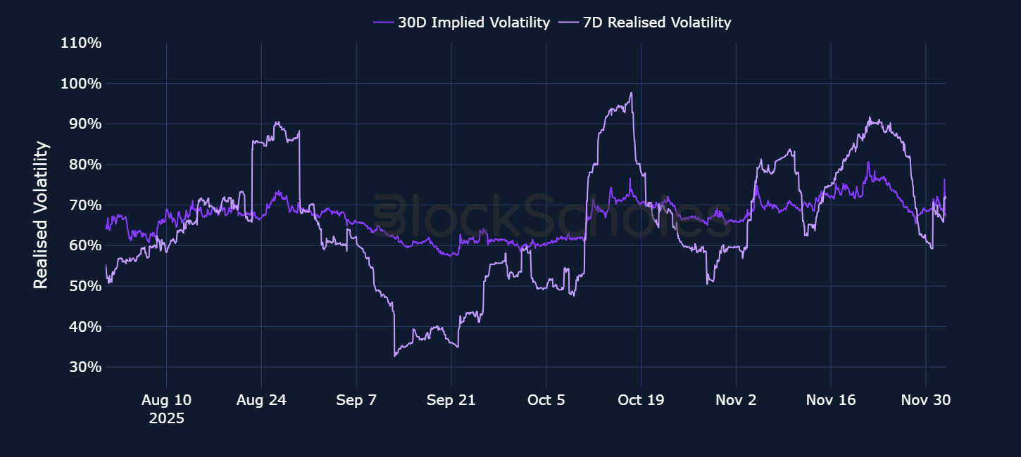 ETH’s spot price has once more reclaimed the $3,000 mark after falling as low as $2,700 on the first trading day of December. Still, it remains below its all-time high by 35%. Therefore, positioning in its options markets are unsurprisingly bearish. While the recent reclaim of the psychological $3,000 level has seen a sharp recovery in its put-call skew ratio, that recovery hasn’t been enough to shift towards a premium towards calls just yet. Instead, markets have priced out much of their extreme premium for downside protection, without pricing-in a dramatic reversal of the circa 40% drawdown just yet. Similar to BTC, ETH’s term structure of at-the-money volatility inverted during the selloff on Dec 1, 2025, following a more than 10 point increase in realized volatility. Both open interest and trade volumes have been dominated in calls over the past week, a reprieve from the put-heavy activity we saw in early November.